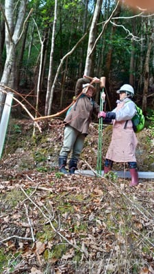 今回は、苗、鍬、ツリーシェルターなどを持って川を渡る必要があったが水も少なくスムーズに渡ることができた。植樹した苗は、会で2~3年育てたものでウバメガシ、アラカシ、イチイガシなど約200本。植樹した苗には獣害対策としてツリーシェルターを被せました。