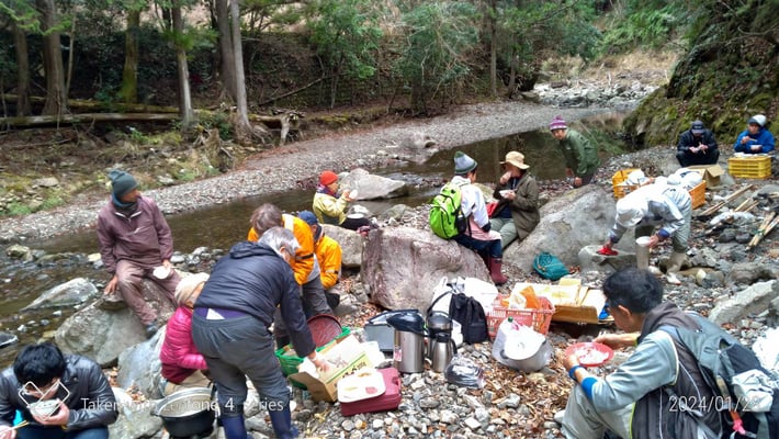 作業も昼までに終わり、河原でいつものように会員の手料理で舌鼓。気持ちの良い川のせせらぎを聞きつつ終了。