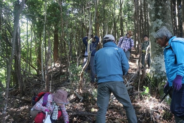 中辺路町水上自然林(多屋林業様所有)の最上部の観察と、2016年から2019年までの4年間田辺市が主催し当会も参加して行った天空三分植樹地の観察を行いました。