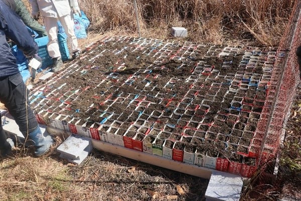 現地に到着後手分けしながら作業準備、初めて参加して頂いた方と一緒に手順や内容を話しながら牛乳パックにどんぐりを入れ苗づくりを始めました。いつもの手順で作業を始めた時に「どんぐりはどちらが上に植えたら良いですか?」と尋ねられ、私がいちいがしの会に入り最初に苗づくりをした時のこと、本当に芽が出てくれるのかと不安になったことなどを思い出しました。