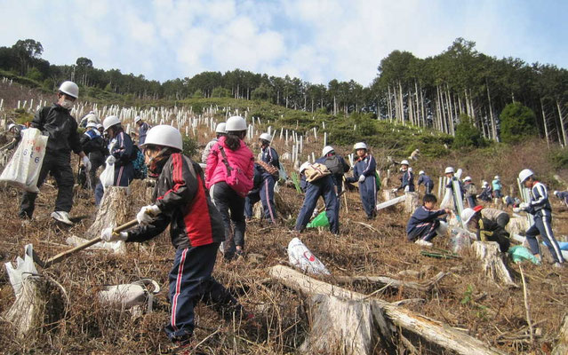 Natural forests are where animals find their food, but they are shrinking. In mountainous areas, deer, wild boars, monkeys, and other wild animals have come down into human settlements in search of food, causing damage to crops. Meanwhile, cedar and cypress trees in cultivated forests do not hold soil because of their shallow roots and, moreover, draw large amounts of water from the ground, adversely affecting the environment. In fact, in recent years, there have been many landslides, and river water levels have dropped significantly. And in the sea, rocky-shore denudation is observed, possibly caused by the loss of forests.